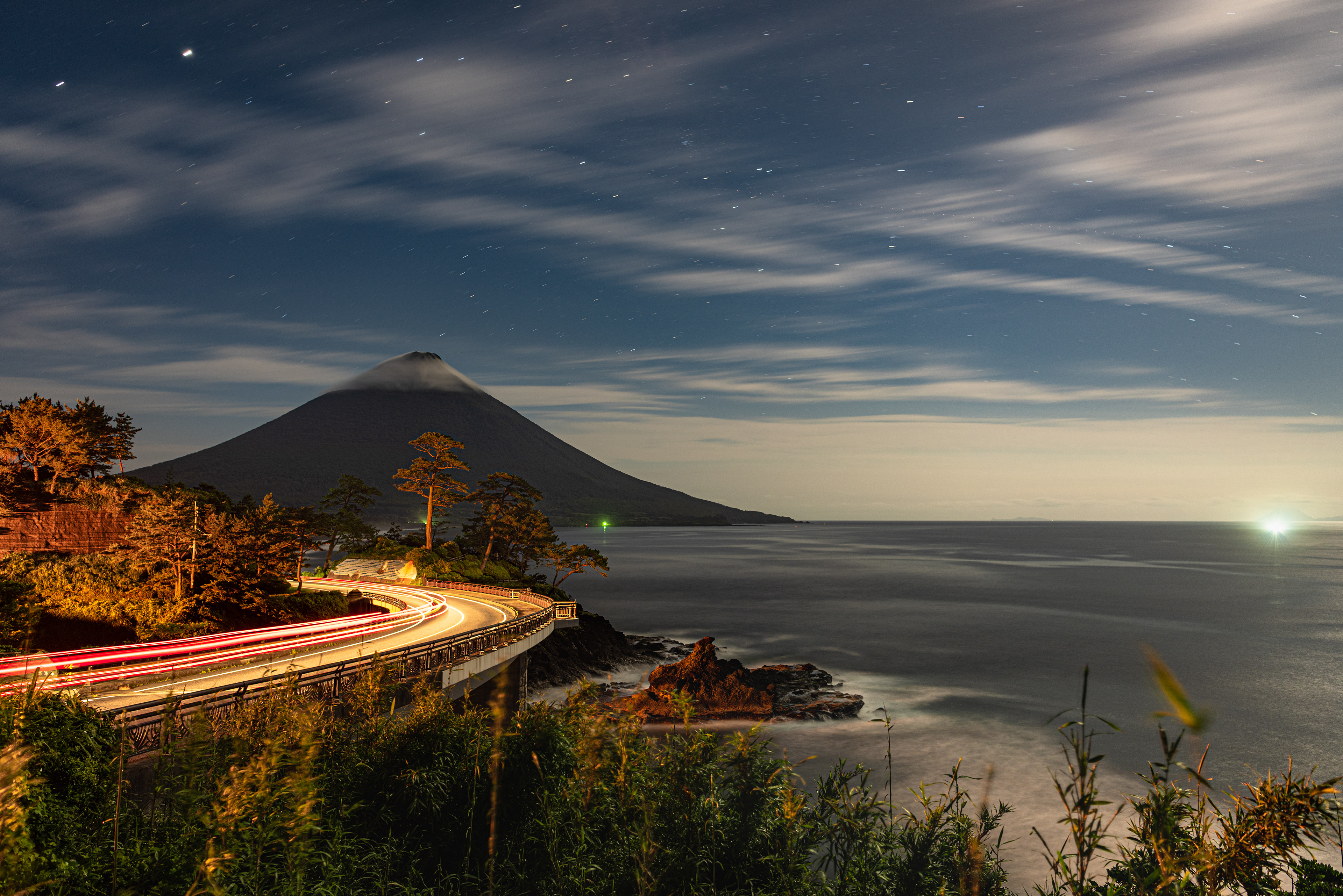 鹿児島では珍しい風雪の朝、けあらしに霞む開聞岳